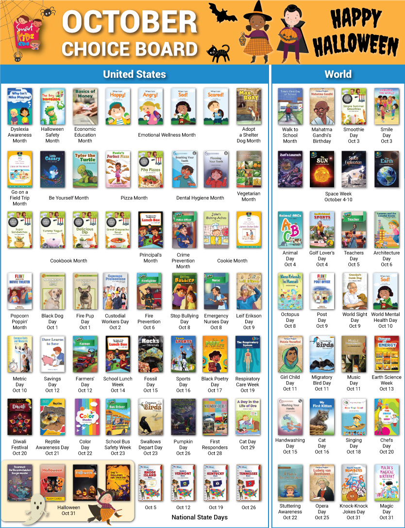 Whether your child wants to learn about animals, explore different professions, celebrate world cultures, or enjoy fun reads like Mr. Clip Clop and Cathy & Cody-Simple Summer Smoothies, our Choice Board makes reading exciting all month long.