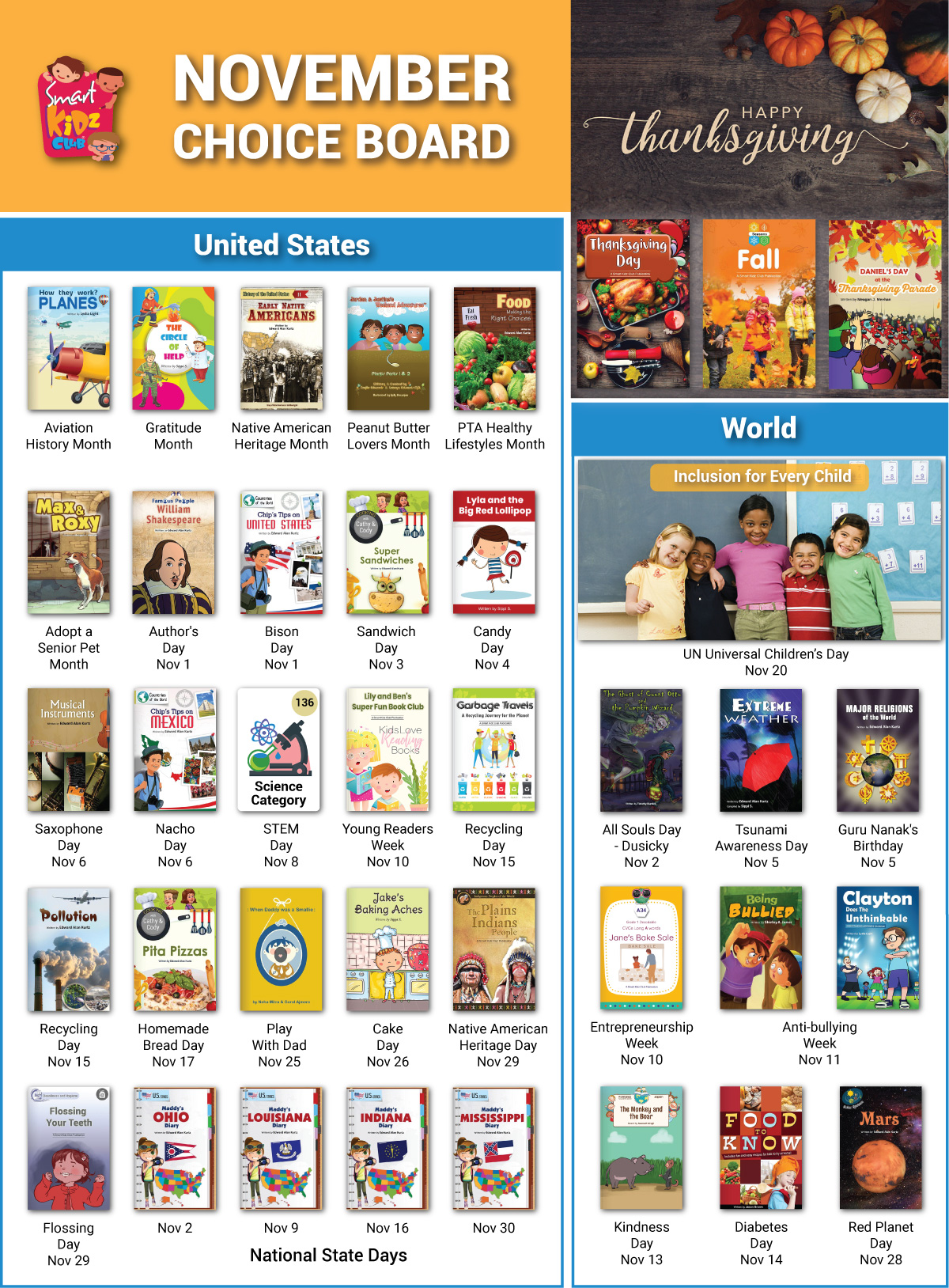 November is bursting with learning adventures — and Smart Kidz Club is here to make every day count! Over the next 15 days, we're diving into stories that celebrate invention, gratitude, history, and even a love for peanut butter! 🥜✈❤️